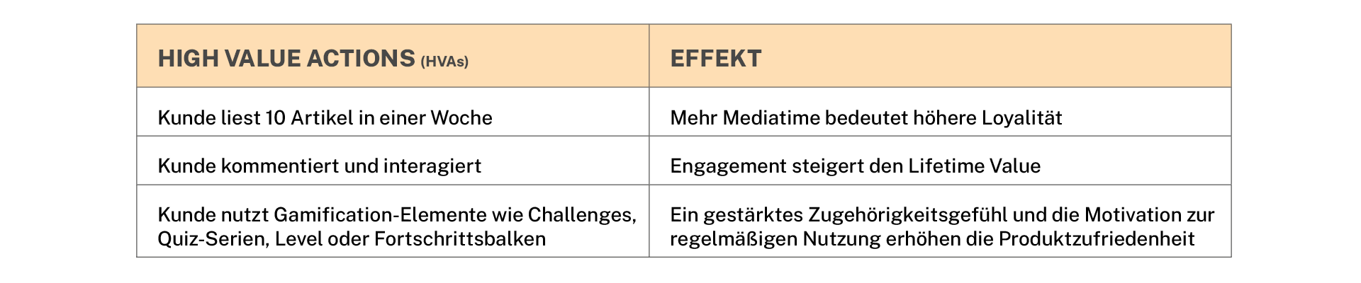 Kundenaktivitäten mit großem Einfluss auf die Bindung und den langfristigen Wert eines Nutzers – sogenannte High Value Actions (HVAs) – spielen in der Customer Journey eine zentrale Rolle. Dazu zählen etwa die Newsletter-Anmeldung im Abo-Funnel oder bei Plus-Abonnenten das Kommentieren und Lesen von Artikeln.