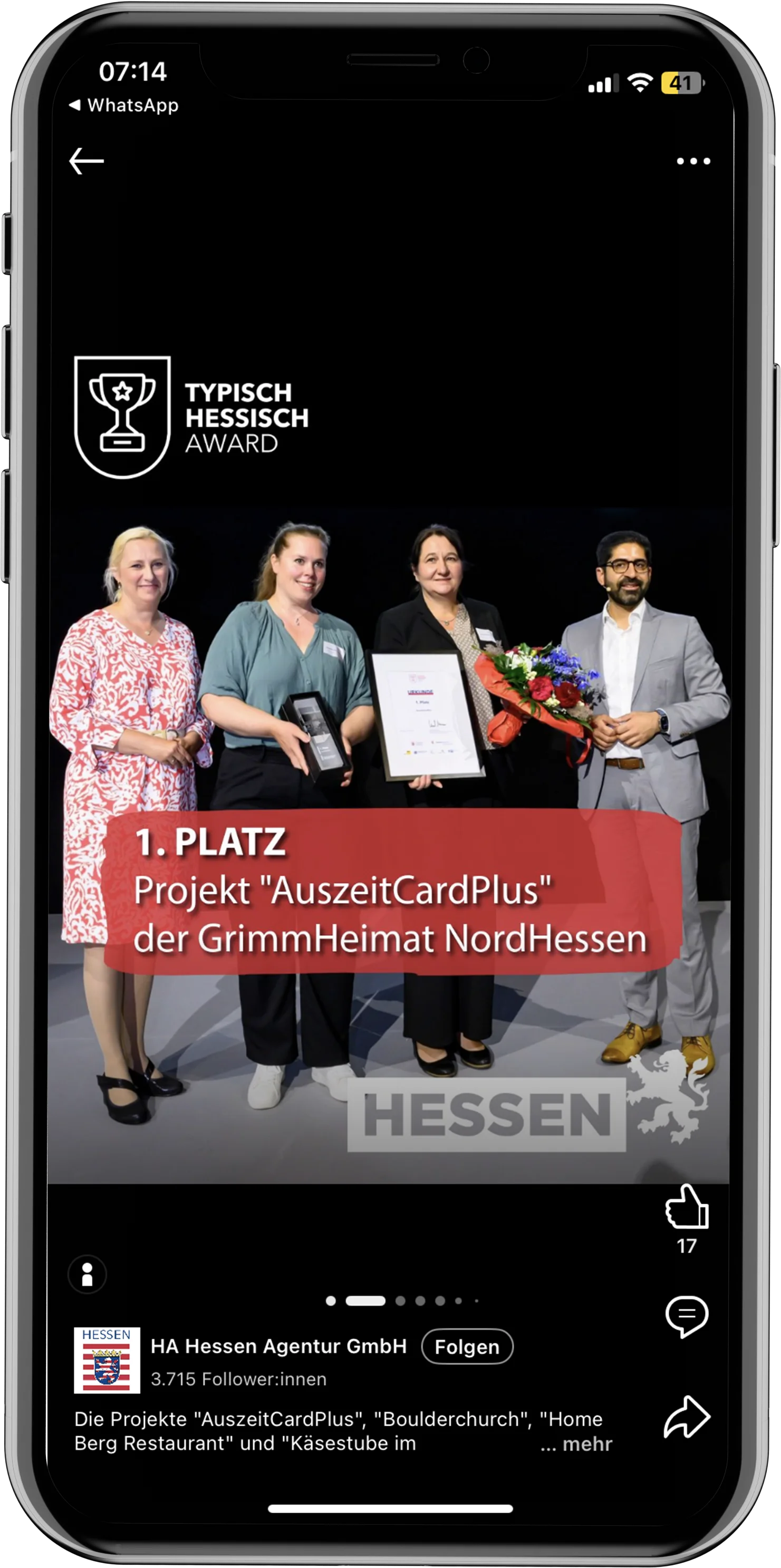 Die AuszeitCardPlus öffnet ihren Nutzern den Zugang zu rund 100 Freizeit- und Kultureinrichtungen in Nordhessen und kann zugleich als steuerfreier Sachbezug von Unternehmen eingesetzt werden. So entsteht ein System, das Tourismusförderung, Mitarbeitermotivation und Standortbindung intelligent verbindet.