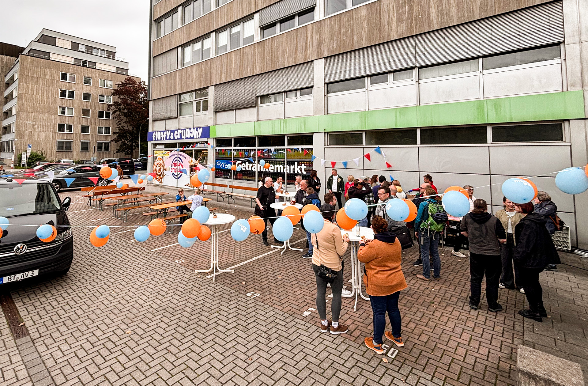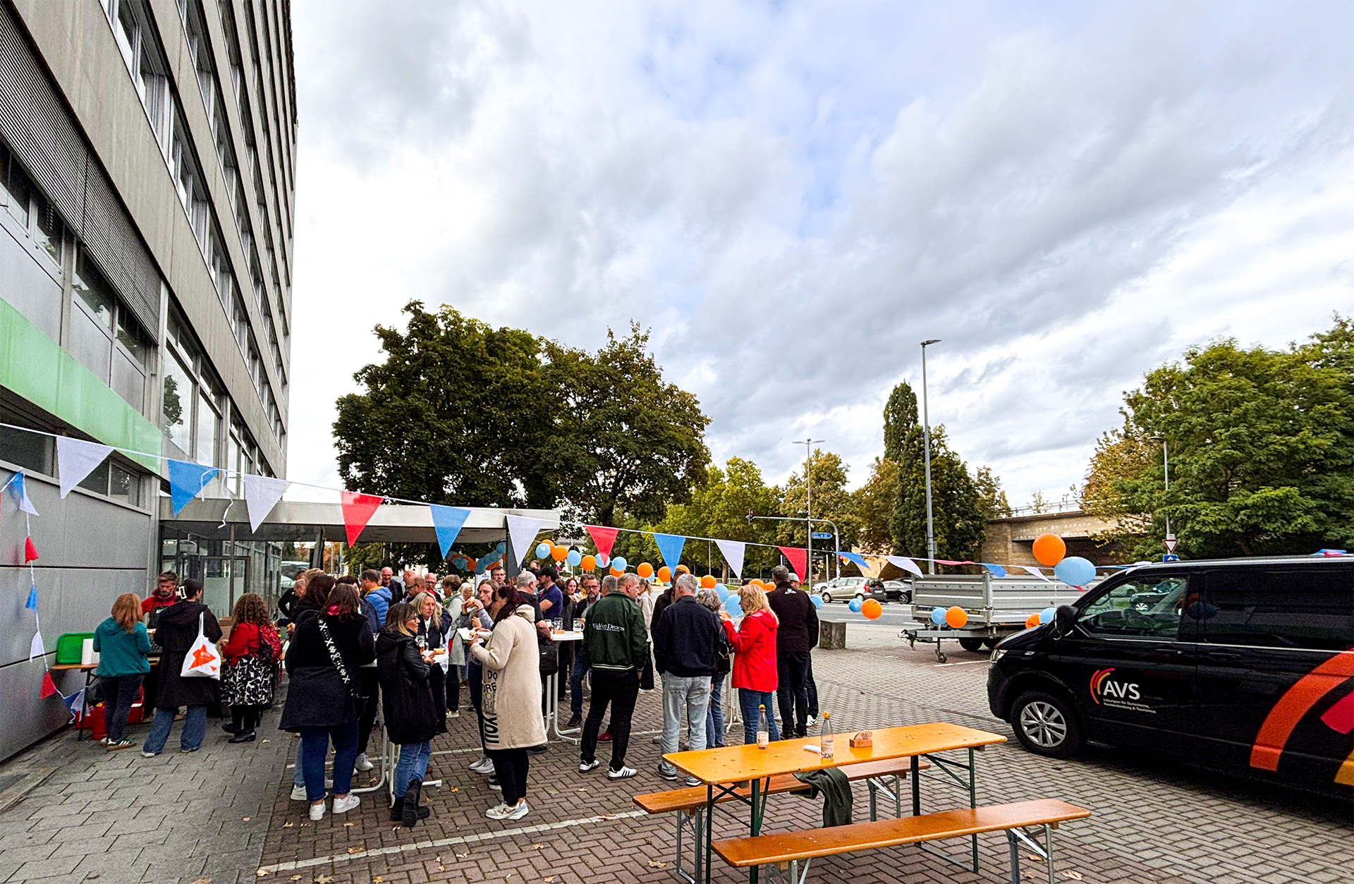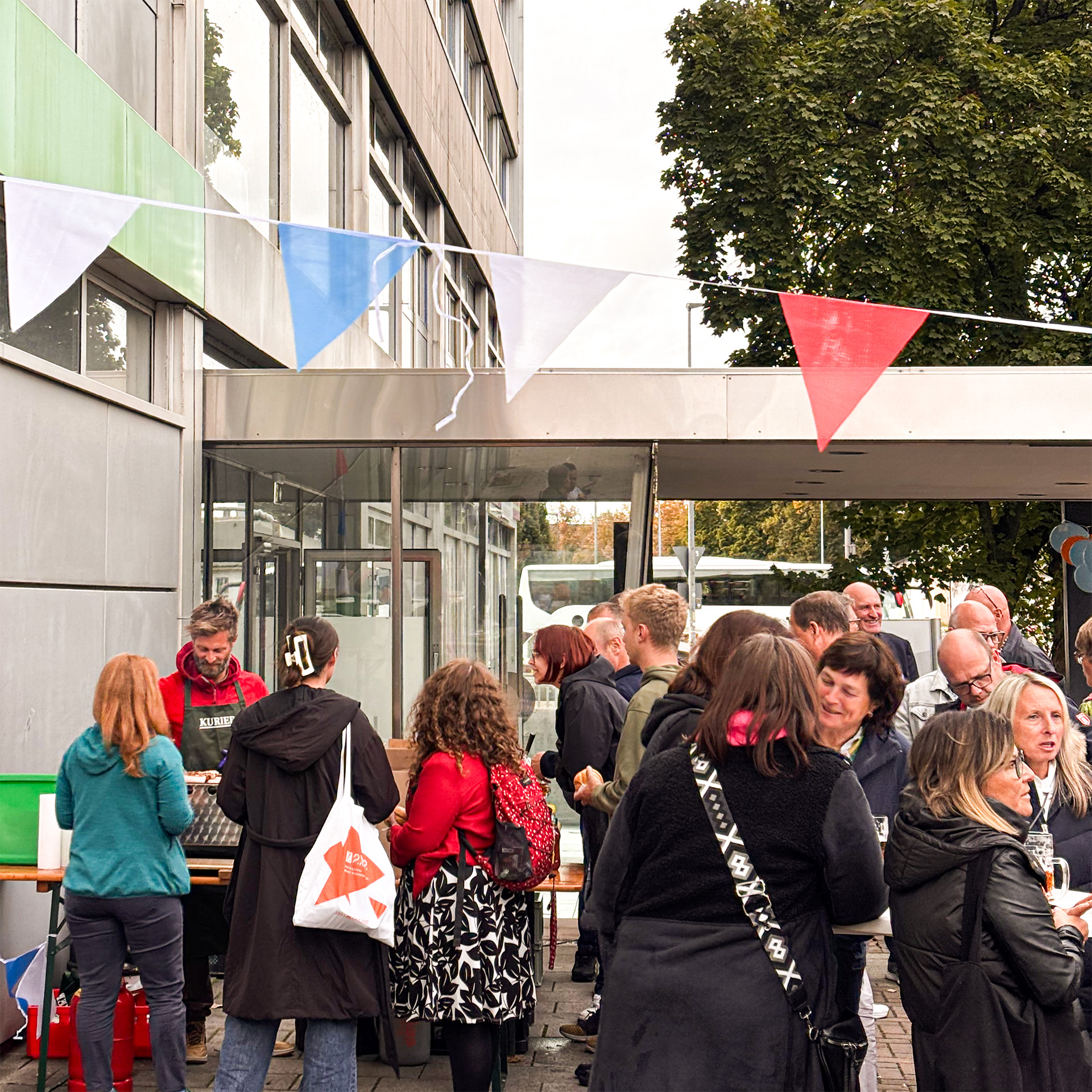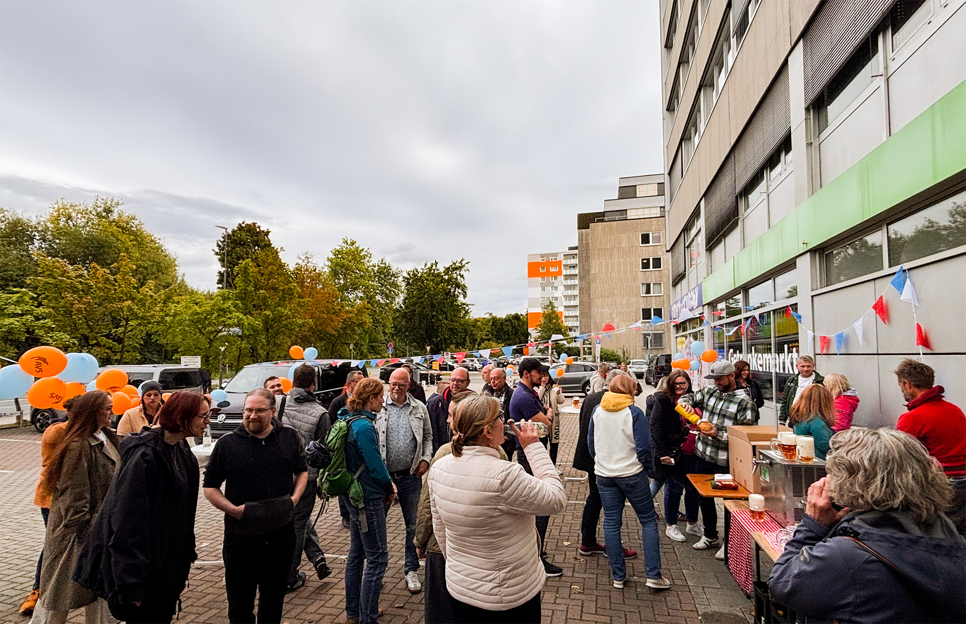 Der Nordbayerische Kurier hat uns mit allem, was das Herz begehrt, ausgestattet: kühlem Bier, leckerer Bratwurst und einem super Grillmeister. Auch wenn das Wetter vorher für ein paar Sorgenfalten gesorgt hatte, blieb es trocken und wir konnten gemeinsam ein schönes Fest auf unserem Parkplatz feiern.