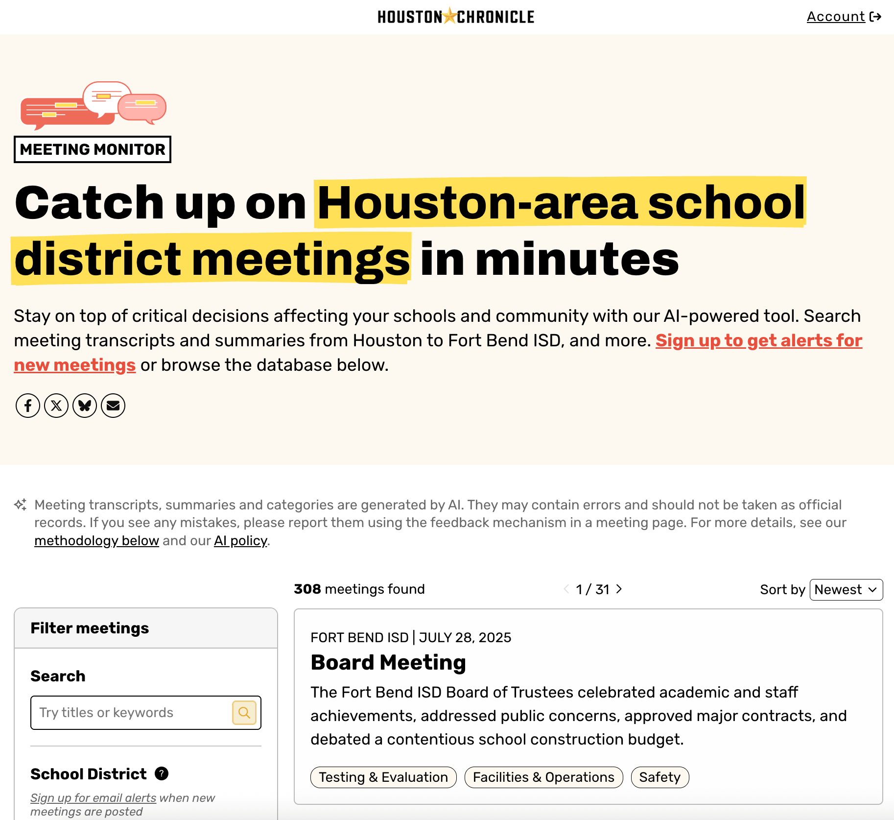 Weitere Tools: Der Restaurant-Chatbot „Chowbot” nutzt lokales Gastronomie-Fachwissen und nutzt die Stärken der jeweiligen Lokaltitel (z. B. in Houston die Kolumnen eines dort beliebten Gastrokritikers). „Meeting Monitor” hat bereits über 250 Ratssitzungen abgedeckt und wurde vom internen Tool zur öffentlichen Version für Houston Chronicle-Leser.